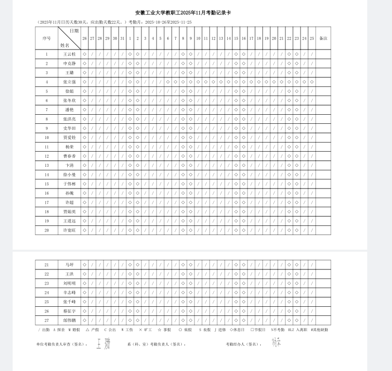 工程研究院教职工2025年11月考勤记录