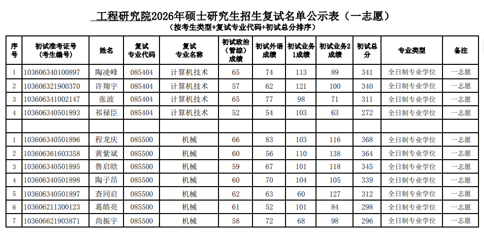 工程研究院2026年硕士研究生招生复试名单公示表(一志愿)